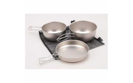 金属加工の待ち、新潟県燕市製のチタンクッカーセットです。チタン製クッカーはとても軽く、少しでも荷物を軽くしたいという方にはおすすめです。